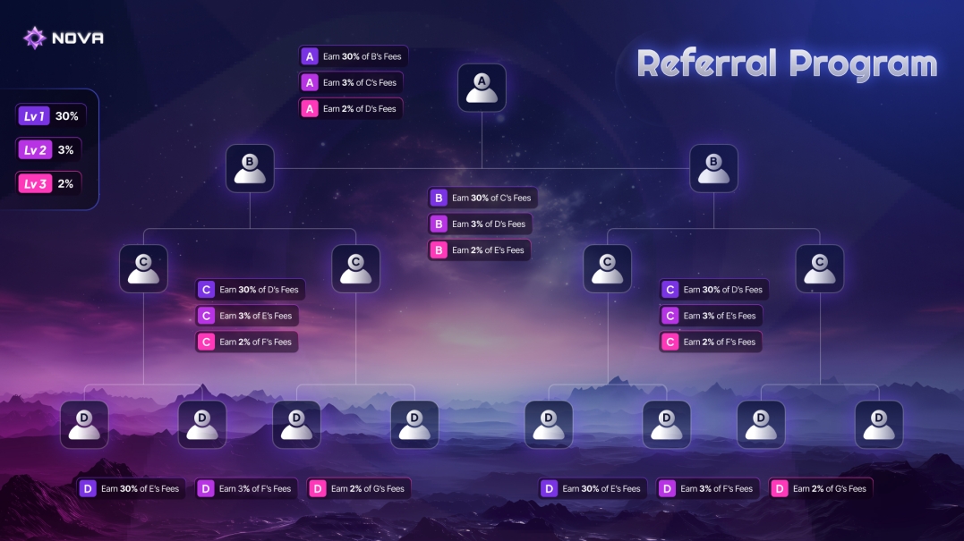 Tier 3 - Extended Referrals: Earn 2% of Nova's 1% fee on every trade.